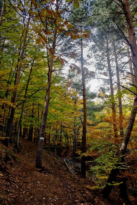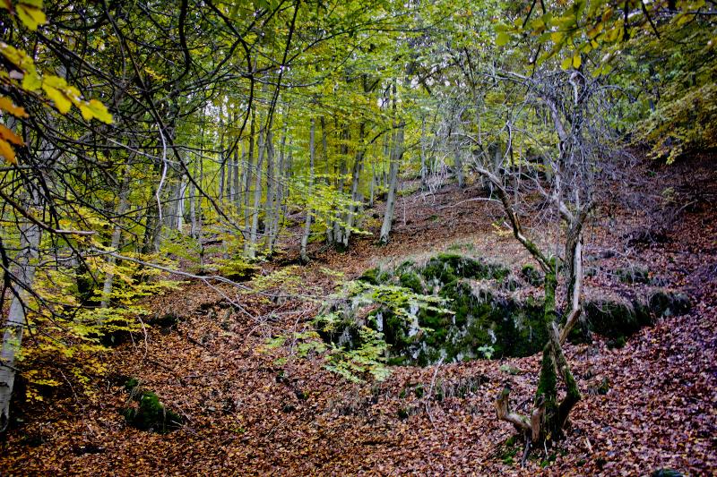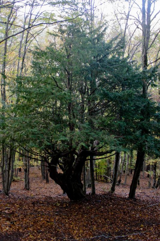 Al principio nos encontraremos con los robles, que aquí se llaman rebollos o melojos, de hojas lobuladas, que se resisten a caer hasta avanzado el invierno. La senda se estrecha hasta cruzar un arroyo y muy pronto el camino vuelve a subir por una zona de hayas largas y puntiagudas, en busca de los rayos del sol, que a duras penas se abren paso entre las copas de los árboles. A la izquierda encontraremos, señalizado, un magnífico ejemplar de tejo (foto de la izquierda) , árbol de madera muy resistente que se utilizaba para hacer arcos, y que puede llegar a vivir hasta 1.500 años. Como el acebo -cuyas hojas son típicas en las postales navideñas-, está protegido por ser escaso y de crecimiento muy lento.