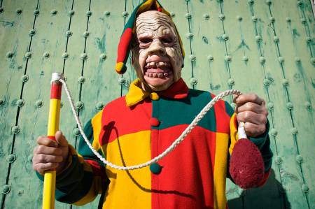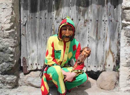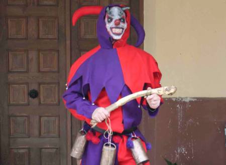Su vestimenta amarilla, verde y roja con capucha y ribetes negros, lleva a la cintura cencerros y en la mano cachiporra rematada en forma de cabeza, careta de plástico de imitación carnavalesca veneciana y abarcas a los pies.