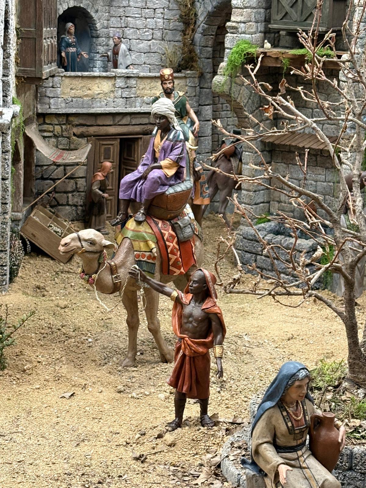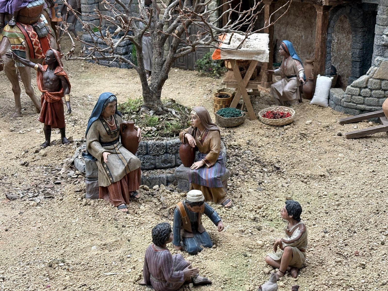 Así es el belén que la Asociación de Belenistas ha levantado en la caseta de madera que se ha ubicado en la Plaza Mayor. Por primera vez el Belén está construido en el centro del espacio y permite disfrutarlo por sus cuatro lados lo que permite un recorrido original y más cercano sobre la sucesión de escenas que recrean no sólo el nacimiento de Jesús en el portal de Belén, sino representaciones de la vida cotidiana (niños jugando, artesanos trabajando, agicultores en sus labores o la propia arquitectura de los edificios que descubre pasillos escondidos, cuevas imposibles y juegos de agua con grandes puentes que cruzan desfiladeros profundos. Un recorrido, de sentido único, que te va llevando de escena en escena hasta llegar a la principal: portal de belén.