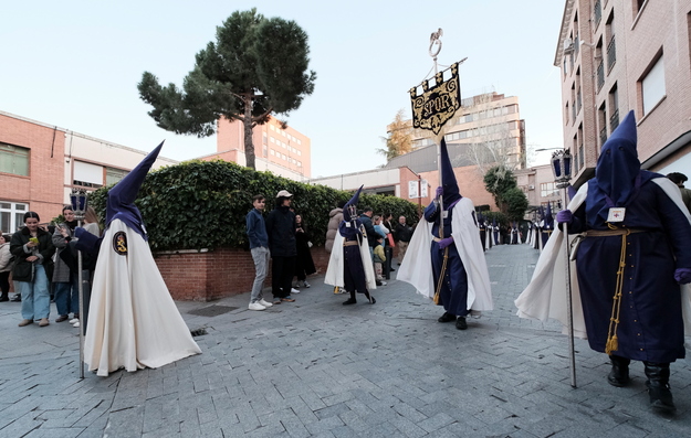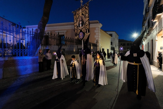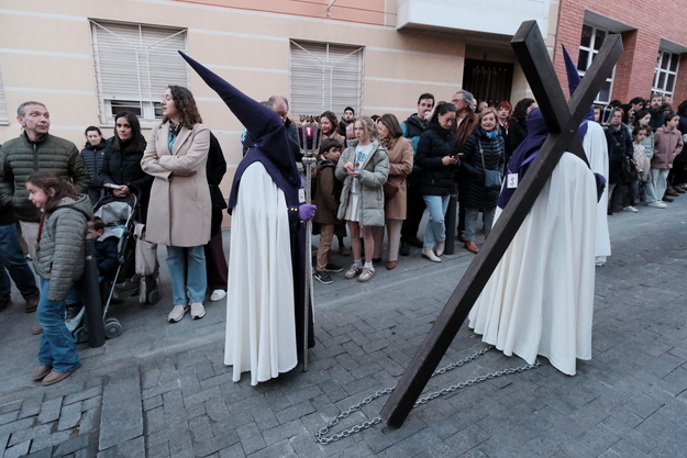 Los hermanos visten capa de color crema y capirote morado. Muchos de ellos ya participaron en la procesión de la Misericordia, que esta hermandad realiza el día de Lunes Santo y que abre los desfiles procesionales de Guadalajara.