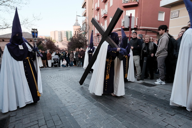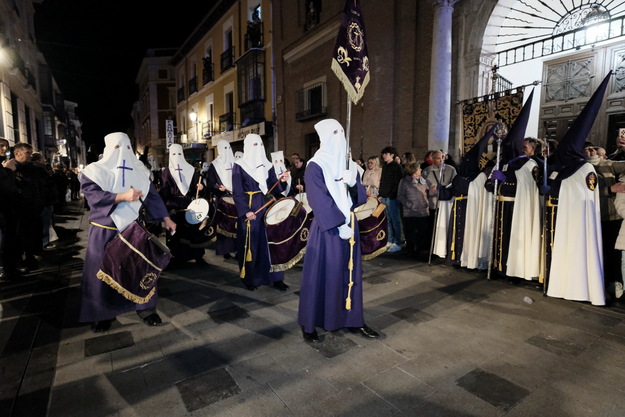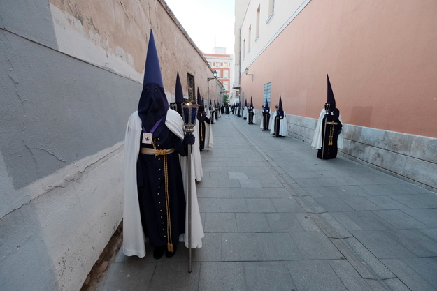 En la procesión de Jueves Santo, la más numerosa, los cofrades llevan una sencilla túnica morada, con cíngulo amarillo, y capirote blanco, que es sustituido por uno negro para la procesión del Silencio y Santo Entierro ya el Viernes Santo.