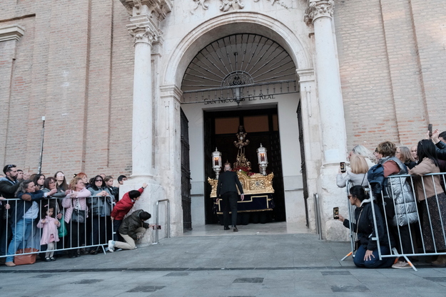 Centenares de personas se han dado cita a la salida del Cristo de la iglesia de Santiago, una operación dificultosa porque debe hacerse de rodillas, poco a poco, para que la cruz no choque con el dintel de la puerta.