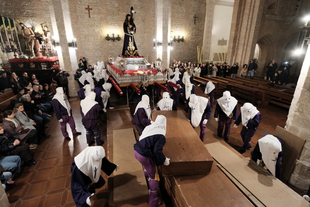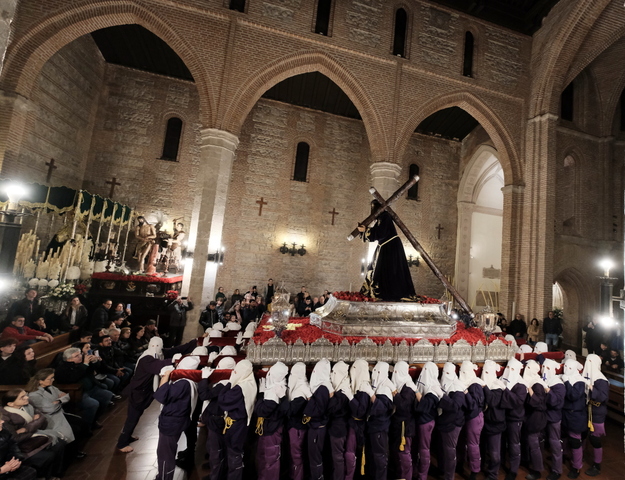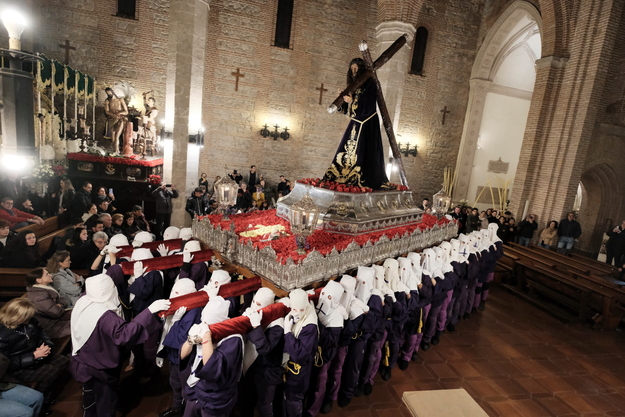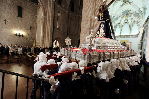 Tanto el trono del Cristo como el de la Virgen se carga con varas al estilo castellano más tradicional. Esta austeridad castellana se expresa también en la música a cargo del grupo de tambores de la Cofradía y del grupo de dulzaineros Mahurotos de Guadalajara, que interpretan piezas de dulzaina escritas para Semana Santa.